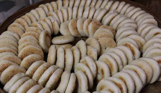 戚继光的光饼,其实也很大程度上起到了陕西锅盔的作用,他本是山东人,也是面食文明的地区,吃烧饼、吃火烧可是家常便饭,这种吃食现代方便,而且粮食类的东西又禁时候,最重要的还是好吃。福建的光饼并不是简单地模仿了北方的烧饼,它比普通的烧饼略小,而且当中还有些肉末和葱花。烘焙的热度使它不仅散发出面和芝麻的香气,肉末和葱花的味道也夹杂其中,吃起来不干、不硬,略带润泽的感觉。因为光饼的面是略带发酵的,所以比北方的烧饼更易保存而不腐败。最为传统的地区,所卖的光饼,中间还会有个小孔,便于用线把它们穿在一起,更有了军粮的便携范儿。