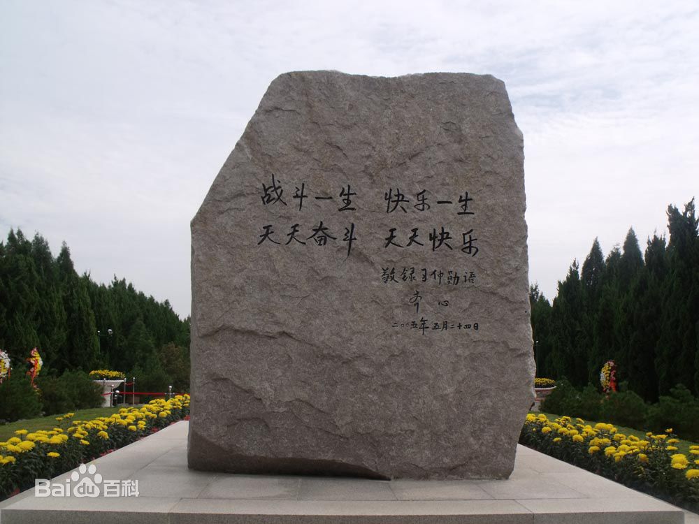 让我感到震撼的,是他那座安放在墓顶的大理石雕像,材质是块不规则的石头,雕刻家按照石头的自然形状,把他雕成坐姿,两只手平放在跷起的大腿上,微笑中不失庄严的脸稍稍仰起,远处的青山、绿水和村庄尽收眼底。他的样子,就像雕刻他的那块石头,普通,沉稳,锋芒内敛,有一种什么力量都难以摧毁的坚毅。雕像后面刻着他的夫人齐心阿姨手书他常说的一句话:“战斗一生,快乐一生。天天奋斗,天天快乐。”