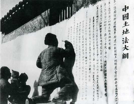 1947年10月公布实施《中国土地法大纲》,图为农民把《中国土地法大纲》抄写在墙上