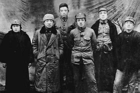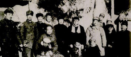 1947年冬,习仲勋(右一)左起:马文瑞、张邦英、张经武、李卓然(前)、贾拓夫、王维舟、林伯渠、贺龙、杨明轩等在陕北绥德县义合镇