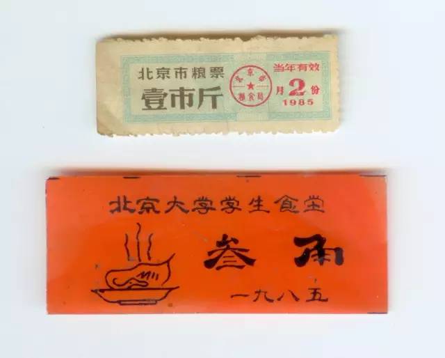 上世纪八十年代中期的北京市地方粮票和北大食堂菜票,85年以前的菜票是纸质的,最高面值1角,后来菜价上涨,85年开始印制3角菜票。