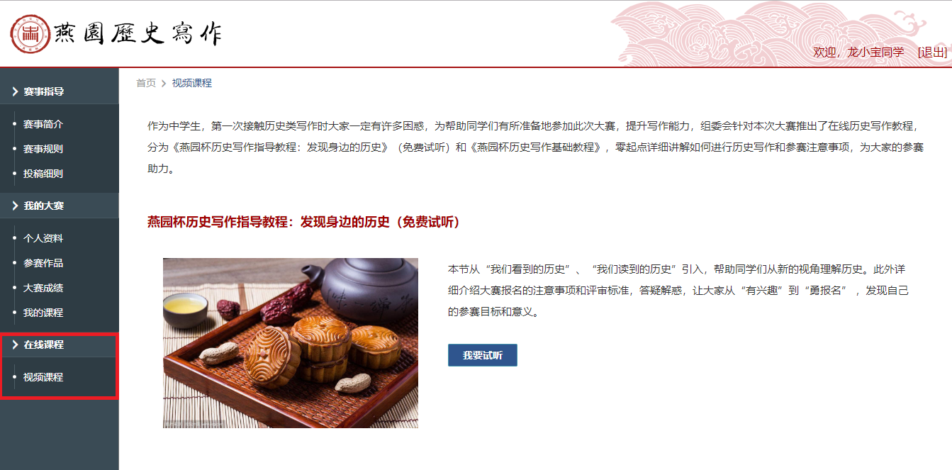 点击我要试听,登录进入大赛报名系统,点击左侧菜单的"视频课程",可进入课程的介绍和购买界面。